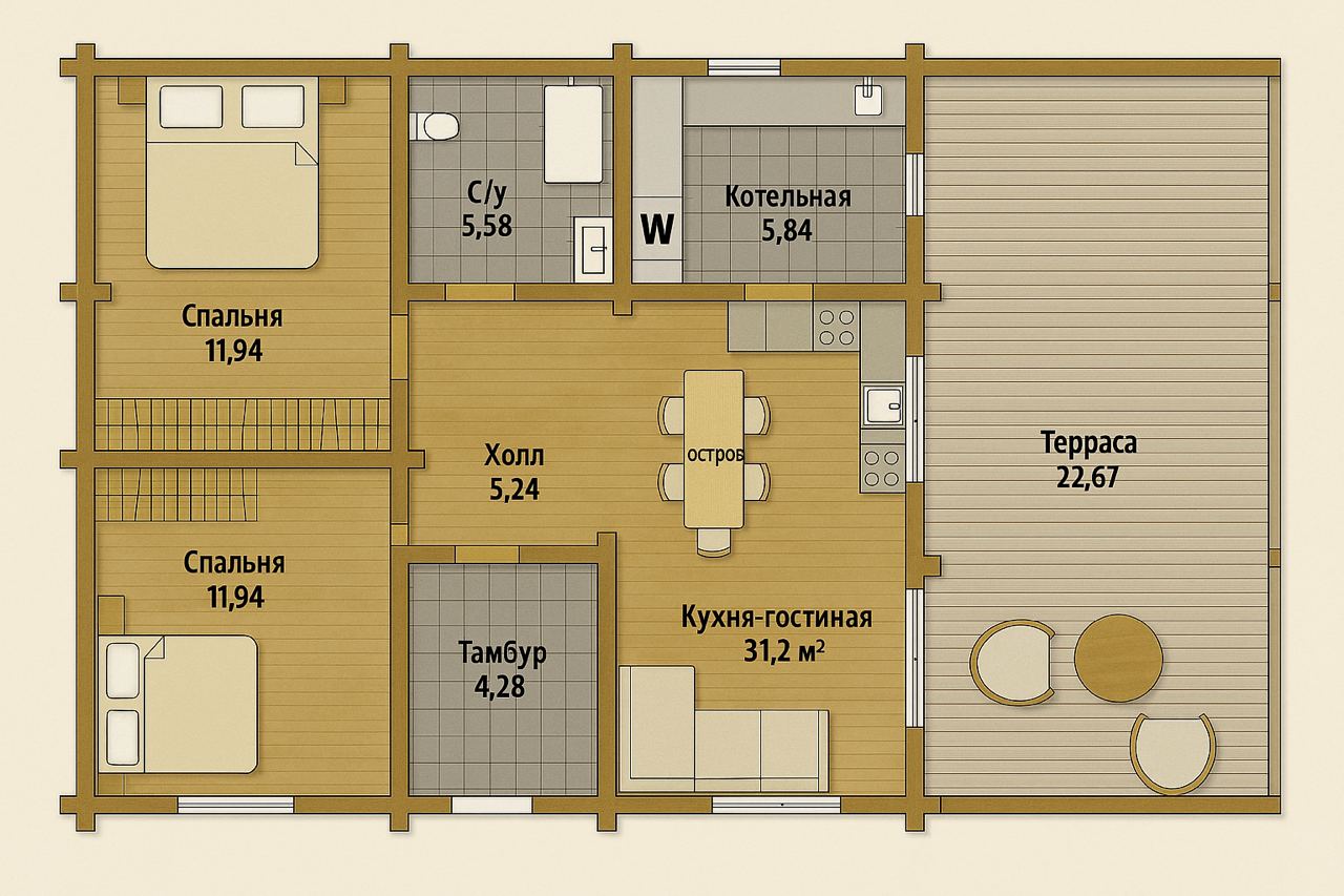 Здесь всё продумано: просторная кухня-гостиная для тёплых вечеров, светлые спальни для полноценного отдыха, и терраса, где утренний кофе становится ритуалом наслаждения.