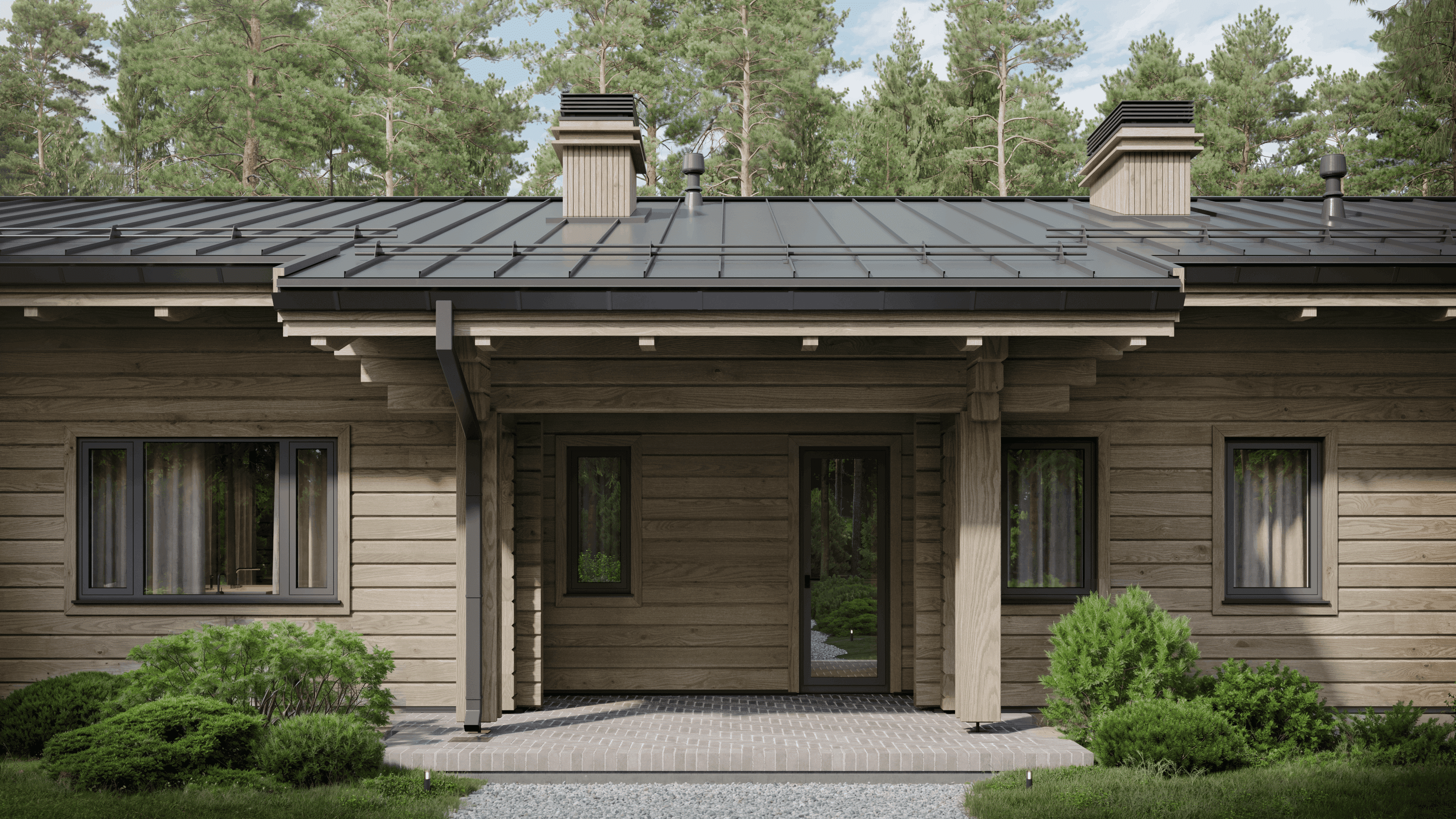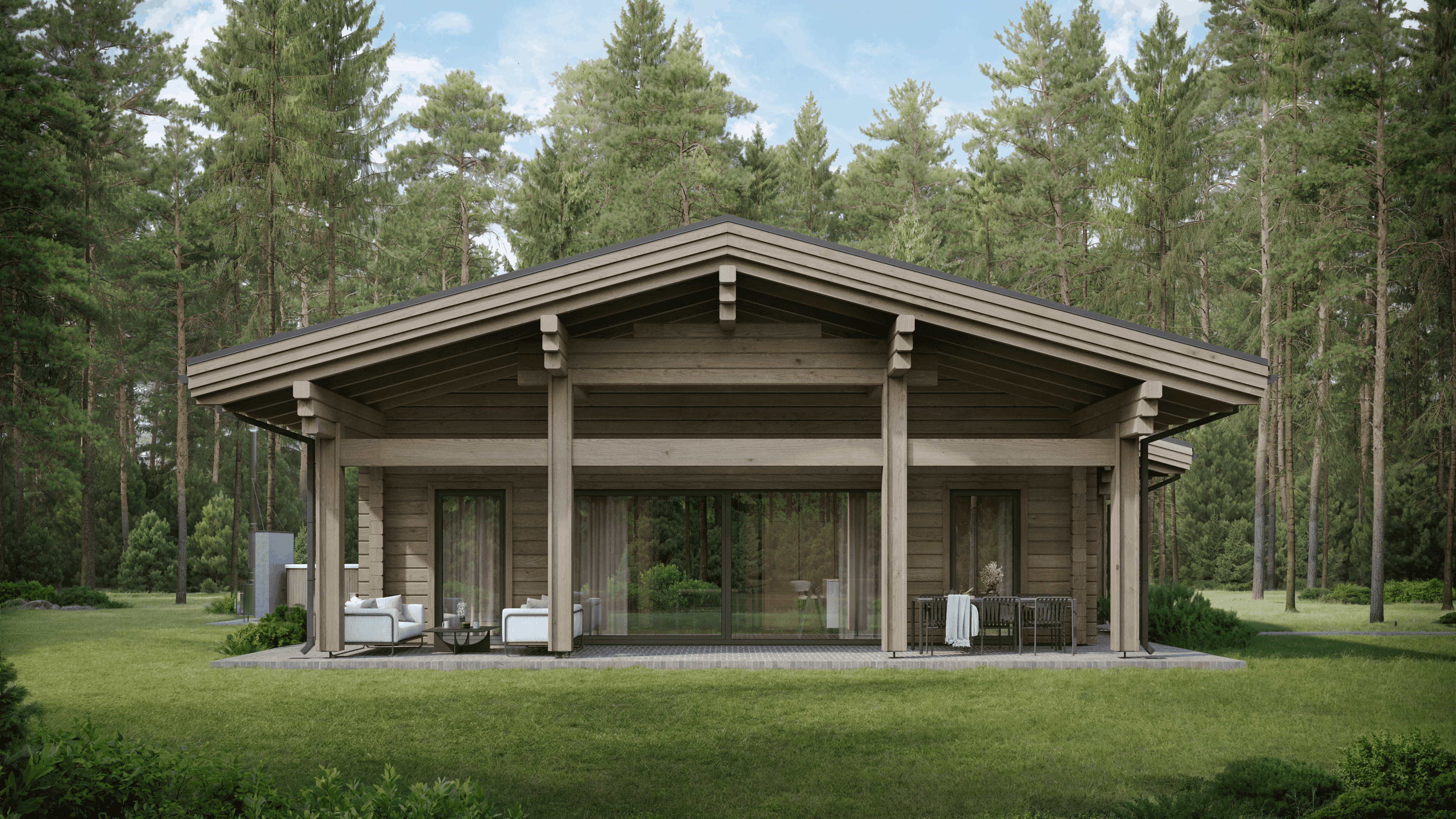 Современный облик и гармония с участком. Выразительность дому придают чистые линии, двускатная кровля с широкими свесами и контраст тёплой древесины с тёмной кровлей. Панорамные окна и большая крытая терраса становятся связующим звеном с природой, а сам дом станет органичным украшением лесного или загородного ландшафта.